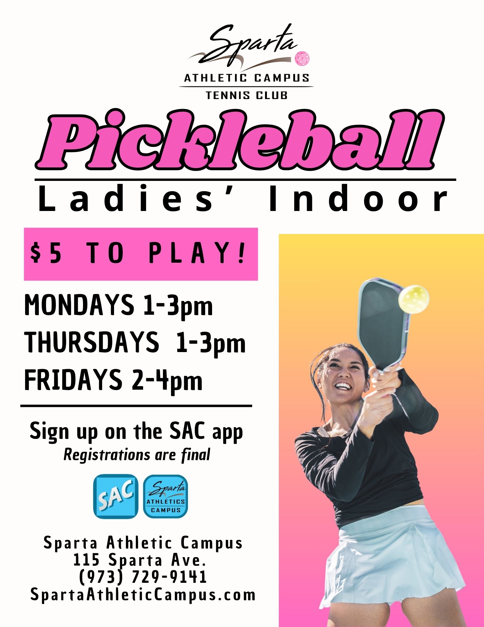 At Sparta Athletic Campus, we offer pickleball activities year round. We have outdoor AND indoor pickleball courts, ensuring uninterrupted pickleball fun! These activities include: open play for various skill levels, clinics and drills run by certified Pickleball instructors, along with court rentals available!